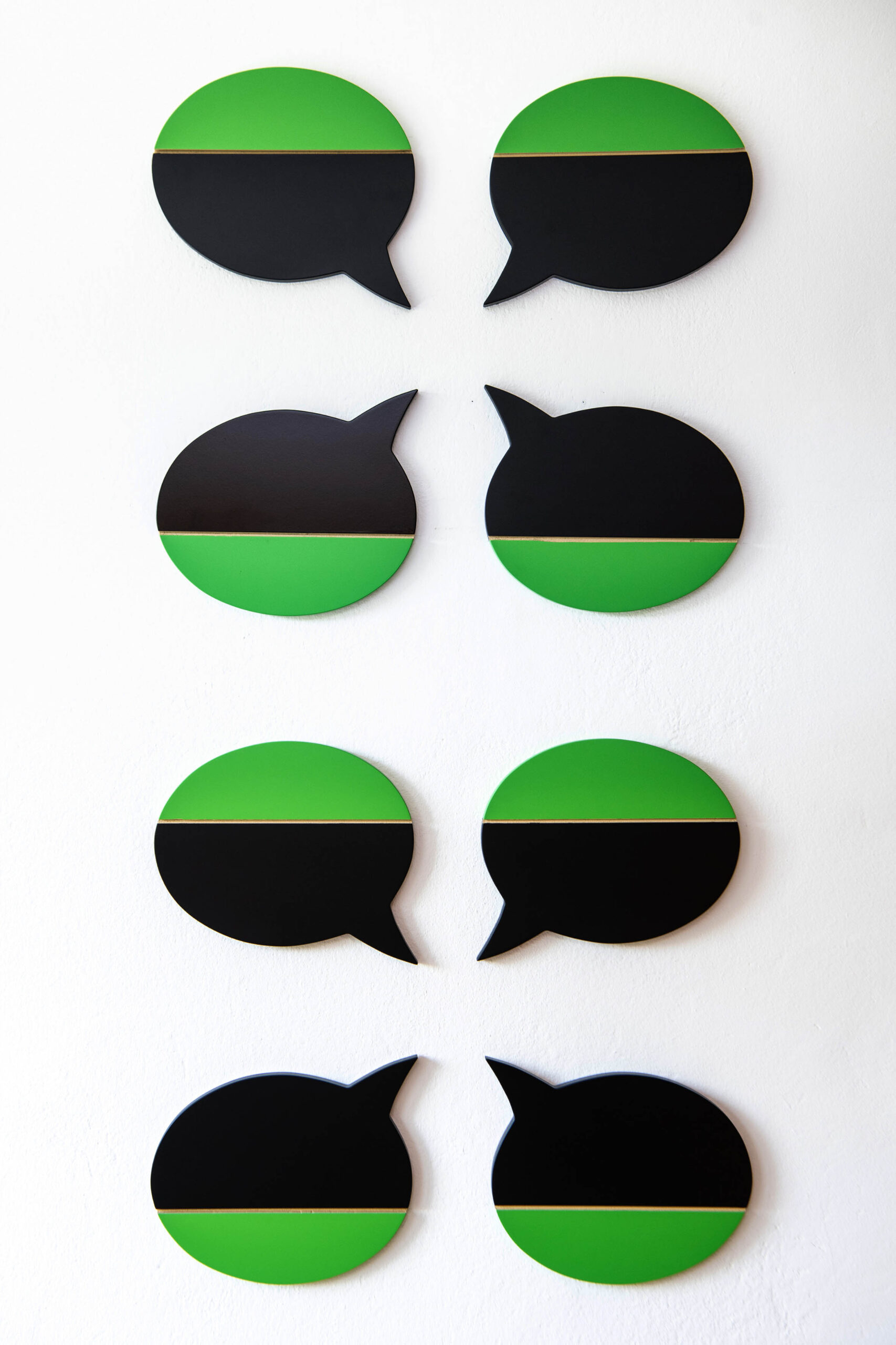 Mit ihren Skulpturen und Wandarbeiten hinterfragt Ulrike Mundt aktuelle Phänomene gesellschaftlicher Kommunikation, die durch Social media und den Verlust an Gewissheiten heute oft gestört sind. Indem sie Ausdrucksformen des Produktdesigns adaptiert und mit handwerklich hergestellten Formen kombiniert, verknüpft sie künstlerische Diskurse mit der Alltagswelt.